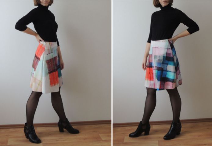 S maximálním využitím látky mi pomoh přítel, který mi ve svém konstrukčním programu spočítal, jak širokou sukni můžu vystříhnout. Protože na sobě látka měla opakovaný vzor, snažila jsem se k sobě sesadit stejné barvy. Musela jsem tedy oba díly položit proti sobě. Výsledek stojí za to :)